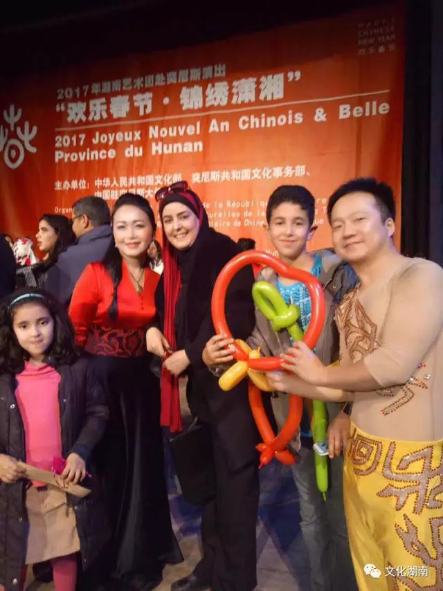 2月21日18:00,“欢乐春节·锦绣潇湘”湖南艺术团的最后一场演出在突尼斯市文化中心举行。突尼斯省省长阿莫尔、省文化代表海迪、突尼斯文化部国际合作司司长拉瓦尼、我驻突尼斯使馆临时代办詹晓波和湖南省文化厅副巡视员王鹏、我驻突尼斯大使馆的全体工作人员、华人华侨、留学生兴致勃勃地观看了演出。大家纷纷表示,湖南艺术团的演出为祖国增光添彩,令在突尼斯的华人感到无比自豪。