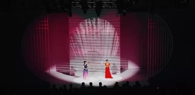 整场音乐会在舞台设计方面,尽量减少了戏曲道具的程式化表现,通过舞台背景的大片留白,为观众呈现了一个极简的设计形式。导演朱珠巧妙地将灯光、投影等技术手段融入到舞美之中,不同色彩和影像在舞台留白处的技术化呈现,朱珠既为音乐会曲目营造出幽美的意境和场景,也给观众留下了极为丰富的想象空间。