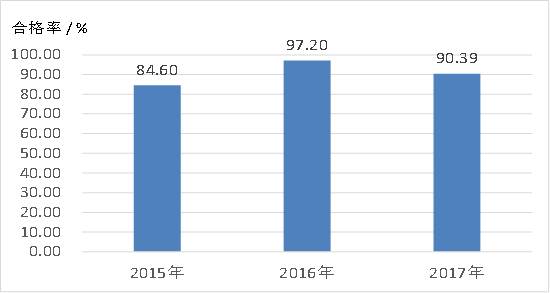 全面反映学生岗位适应能力的专业技能抽查结果显示:2015年、2016年、2017年学生专业技能抽查合格率分别为84.60%、97.20%、90.39%(见图1-3)。