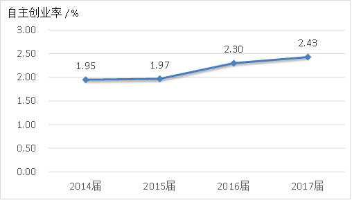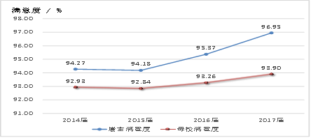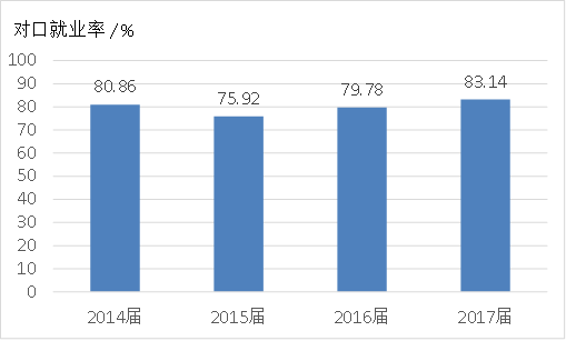 毕业生就业率持续小幅上升,2017届较上届提高了1.71个百分点,较2014届上升了5.47个百分点;从2014届起高职就业率超过全国本科平均就业率或与之持平(见图1-6),说明毕业生有较强的就业竞争能力。
