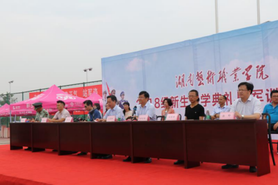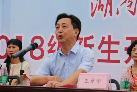 王章华作重要讲话。他向新生们介绍,湖南艺术职业学院作为湖南省唯一一所公办艺术类高职院校,自1951年建校以来在艺术教学和艺术人才培养方面硕果累累,被誉为“明星摇篮”。他强调,要进一步把握新阶段、明确新目标、奋力新作为、创造新业绩,努力创建省文明高校,开启高等学校展现社会文明的窗口,营造团结、文明、和谐、幸福、积极向上、奋发有为的校园环境。要积极筹建本科,努力建设一所国内知名的艺术学院、湖南省内唯一的艺术学院,不辜负省委省政府的期望,不辜负社会各界的支持。他希望同学们志存高远、与时代同行,苦练本领、为人民建功,文明修身、为学院添彩,在树立理想的同时升华信念,努力实现强国梦;在把握青春、珍惜时间的同时,下好苦功夫,求得真学问,学好真本事;在规范言行的同时,用行动为文明创建贡献力量,为学院增光添彩。最后,他对2018级新生军训提出明确要求,要以“服从命令、听从指挥,不怕困难、敢于胜利,因材施教、科学训练,密切配合、安全有序”为基本原则,确保圆满完成军训工作。