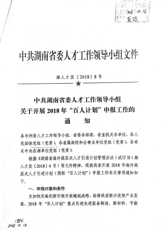 转发中共湖南省委人才工作领导小组《关于开展2018年“百人计划”申报工作的通知》