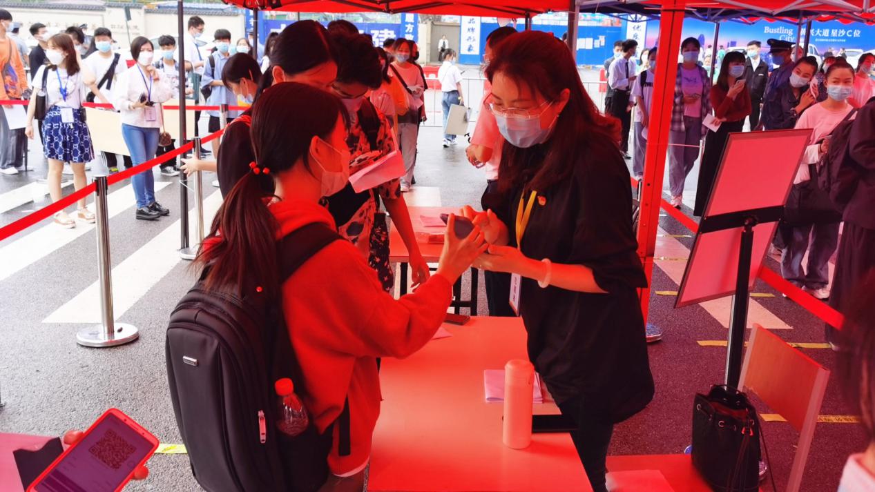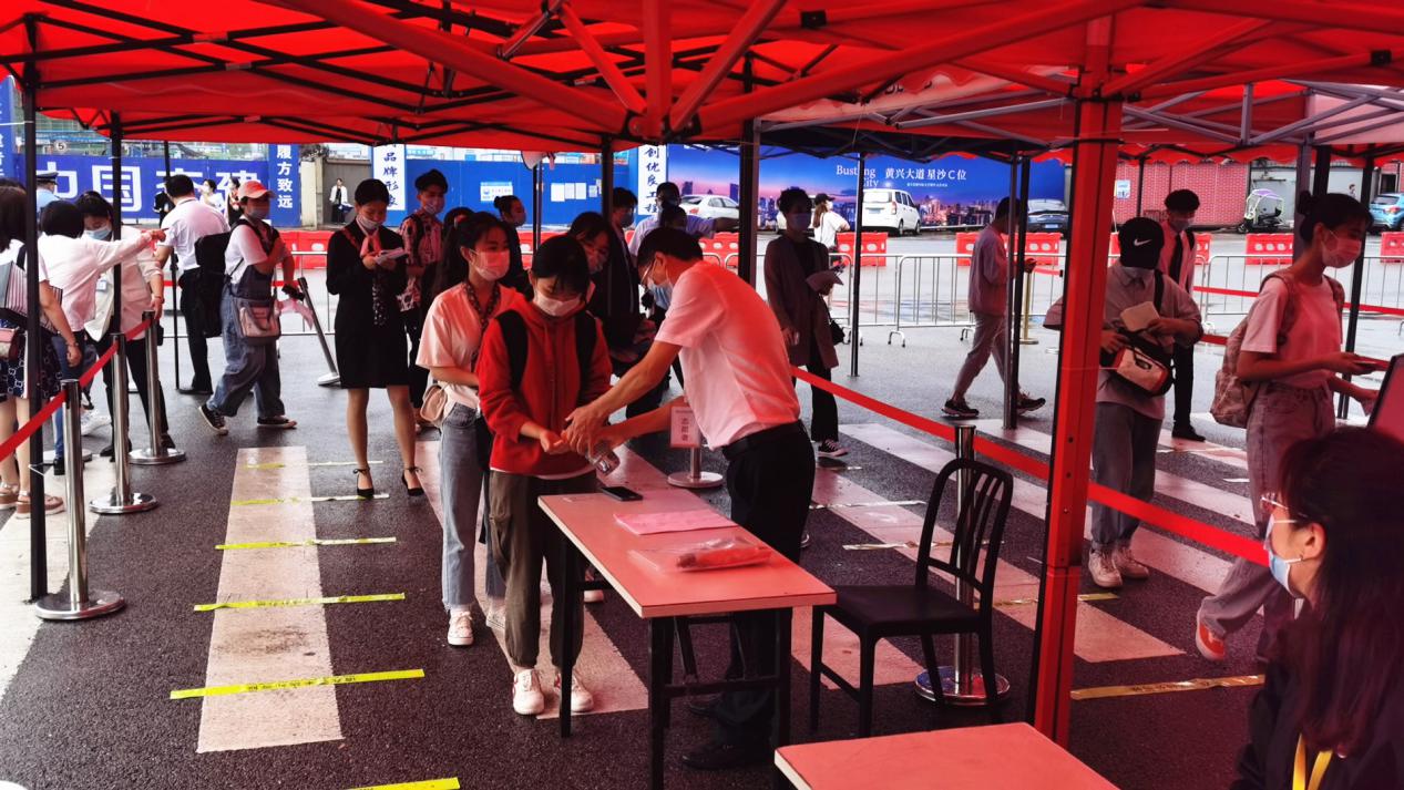 考生进校之后,各固定志愿服务岗的党员老师便会主动上前引导,途中还会耐心细致地为考生答疑解惑,帮助他们舒缓紧张情绪、沉着冷静应考。考生在引导下分别进入相应的考区和候考室,此次学院共设4个考区、50个考场,每个候考室还安排了专门的联络员,候考室内间隔就坐并记录座位号,进入考场前洗手消毒。部分备考场地周边还别出心裁地设置了毕业生作品展览展示区,以便考试更加直观生动地了解学院专业教学情况。