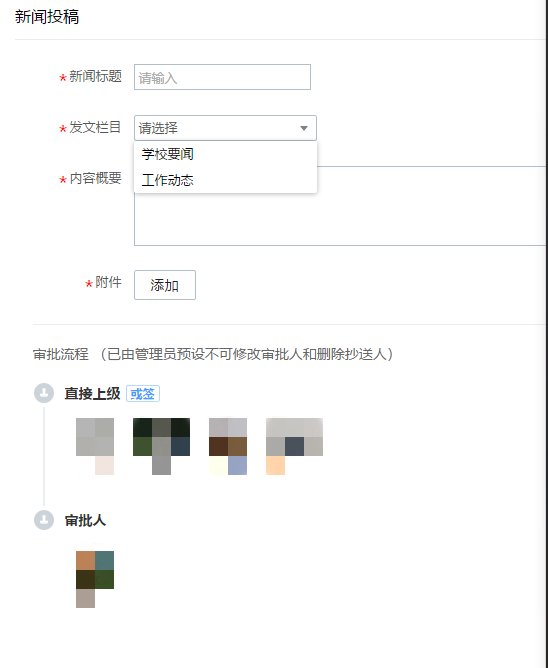 届时各部门将由固定的一位新闻报送员(同时承担编辑审核责任)登录企业微信,在“工作台”中选择“审批”-“新闻投稿”,按照制定流程填写信息、上传稿件(word文档,相关照片插入文档相应位置),提交后由部门领导审核通过,最后汇总党政办(宣传统战部)集中处理。