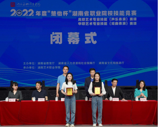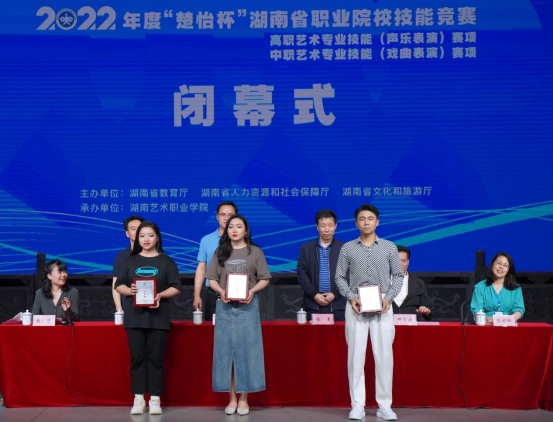 此次艺职院赛点共评出高职声乐表演(民族个人赛)一等奖2个、二等奖3个、三等奖5个;高职声乐表演(美声个人赛)一等奖2个、二等奖3个、三等奖5个;高职声乐表演(流行个人赛)一等奖2个、二等奖3个、三等奖5个;中职戏曲表演(团体赛)一等奖1个、二等奖1个、三等奖2个。湖南艺术职业学院(湖南省艺术学校)作为东道主,共斩获一等奖3个、二等奖1个。在高职声乐表演(民族个人赛)中,学院姜晓媛同学在黄新平老师的指导下获得一等奖;在高职声乐表演(流行个人赛)中,韩伽赛同学在易蓉老师的指导下获得一等奖;在高职声乐表演(美声个人赛)中,罗曼同学在田里老师的指导下获得二等奖;在中职戏曲表演(团体赛)中,付琴思、杨露荣同学在陈奇、刘灿老师的指导下共同获得一等奖。