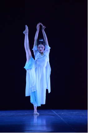 单人舞、双人舞蹈片段集锦《夙愿》《逼上梁山》《声声慢》《黎明静悄悄》,均选自舞蹈经典剧目,展现了扎实的舞蹈基本功和舞台表演能力,也是舞蹈学院“尖子生”培养项目的成果。汉族民间舞剧目《溯.跃》以“鱼”儿们在风浪中搏击寓意在挫折中勇往直前的民族精神;女子群舞《百花争妍》以传统戏曲水袖元素,呈现繁花似锦、祥和美好的中国形象。在传承的基础上超越,在守正的基础上出新,正是舞蹈学院近年来办学过程中所践行的准则。