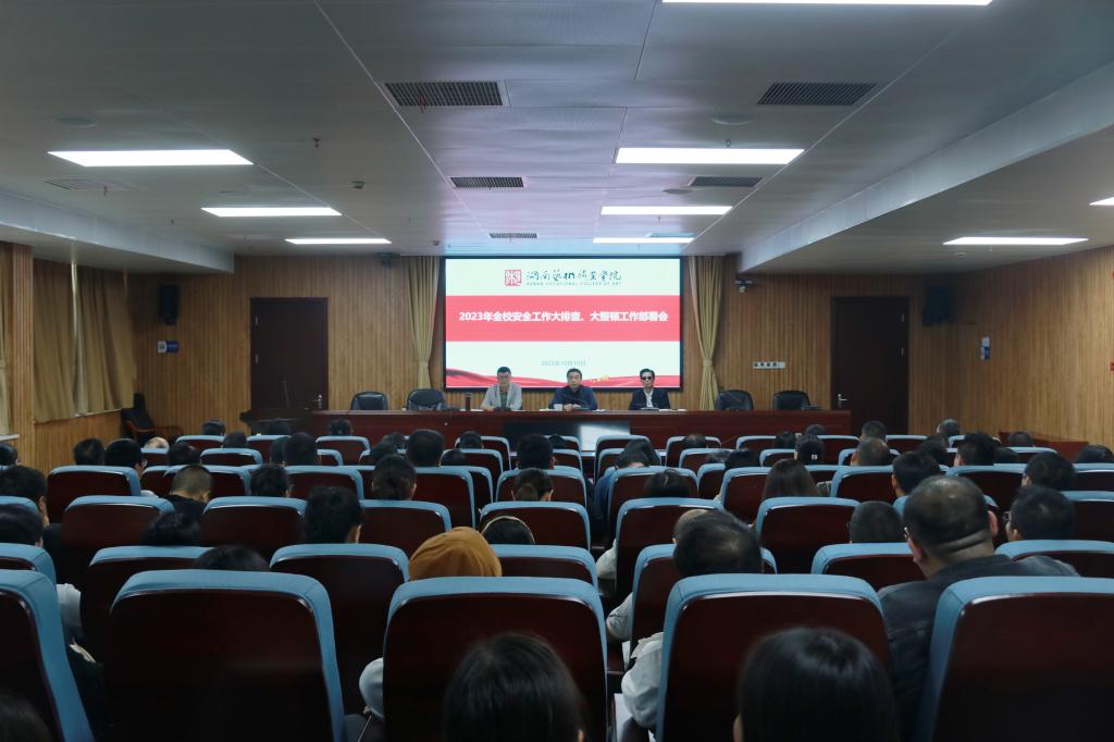 10月19日下午,学校在博艺楼914召开2023年秋季学期安全稳定工作会议,校长周邦春、党委副书记杨向东、副校长周文清、副校长刘家海等在家校领导出席会议,全校各部门党政主要负责人、各二级学院分管学生工作副院长、学工保卫部门全体工作人员及全体辅导员、安全员,学生心理健康中心、医卫科和物业公司负责人一同参加会议。会议由杨向东主持。