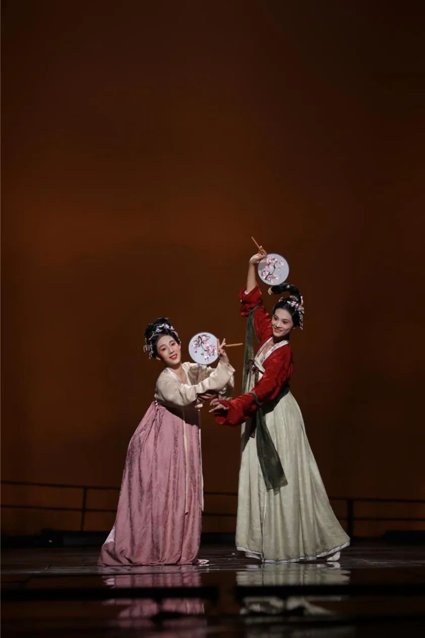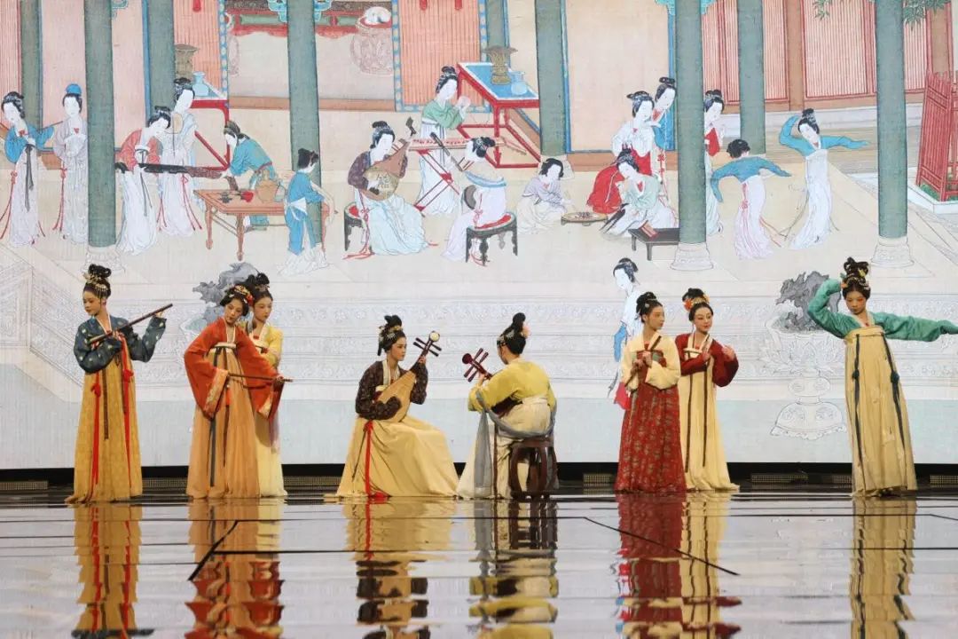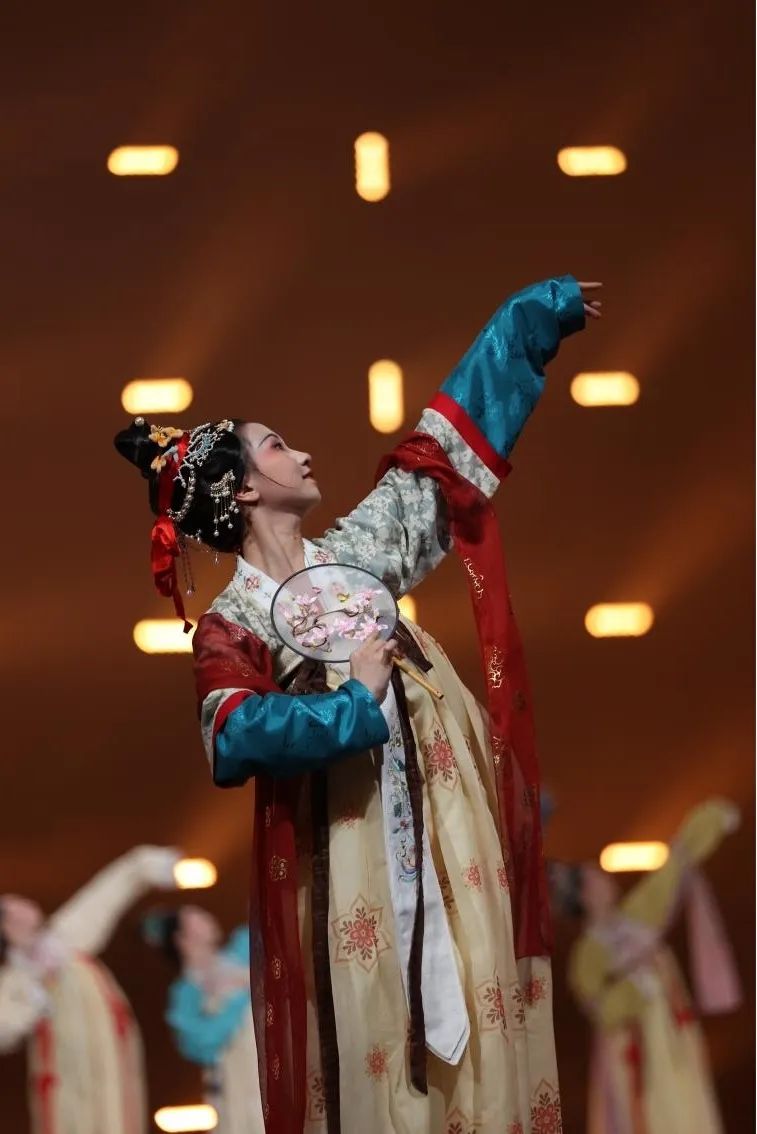 本次演出创造性地采用沉浸式人物造型艺术,借助舞台表演的方式,将中国古代传世名画《汉宫春晓图》活灵活现地“复刻”出来,画中人仿佛“出画入戏”一般,演员们优美的身姿、极富古韵的造型、灵动飘逸的表演,让观众更直观地领略到汉代宫廷春色满园的浪漫景象。