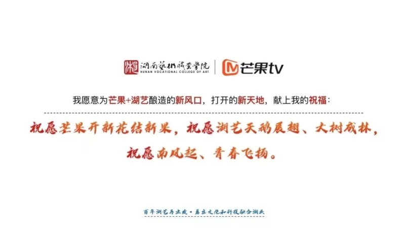 芒果向上,天生青春。以湖南卫视、芒果TV代表的广电湘军,是青年文化的传播者、是有情科技的探路者、是国民精神的塑造者。而百年湖艺,本色是青春,我们培养的人才,有且只有一个愿望,那就是领时代之风骚、开青春之先河。芒果与湖艺,青春与青春的碰撞,将擦出怎样的花火?青春与青春的交融,将引爆怎样的巨能量?我们拭目以待。